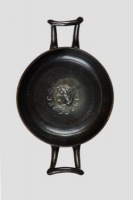 Csak valószínűsíthető ez az egyik kiállított tál esetében. A fekete festéssel bevont csésze közepén domborműves leányfej látható, róla kapta a hasonló díszítésű csészék jelenleg mintegy hatvan darabot számláló csoportja az "Arethusa-csésze" elnevezést. A fej ugyanis az antik érmevésés egyik legnagyobb mesterének, Euainetosnak Siracusa számára mintegy száz évvel korábban készített érméjéről, illetve annak görög változatáról vett levonat. Arethusa nimfa egy hagyomány szerint a dél-görögországi Alpheios folyamisten elől a tenger alatt menekülve a siracusai Ortygia szigetén merült föl, és ott a ma is nevét viselő forrássá változott. Nem tudjuk, miért ez az ábrázolás - és egyedül ez - került a teanumi csészékre, de elképzelhető, hogy a helyi szentélyekben tisztelt istenalakok valamelyikével azonosították. Az sem meglepő, hogy siracusai érmét használtak fel: az egyik teanumi sírban talált csészén egy magát szicíliainak valló mester szignatúrája olvasható.